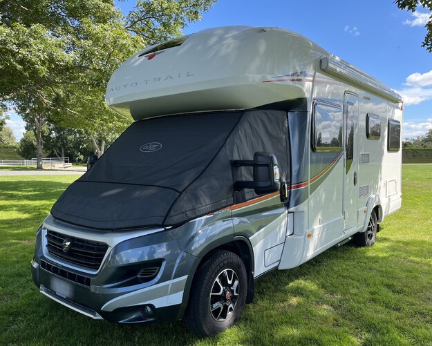 The OCD windscreen covers have been patterned for each vehicle type and are attached to the motorhome with four physical attachment points. The cover is mounted on the top corner of the driver's & passenger's doors. Customized leather surrounds fit around each of the side mirrors. A series of magnets along the back edge of the doors, under the windows and around the bottom edge of the bonnet add additional security for the cover. It is important to note, installation take just 3-4 minutes and a substantial carry bag is provided with each cover.