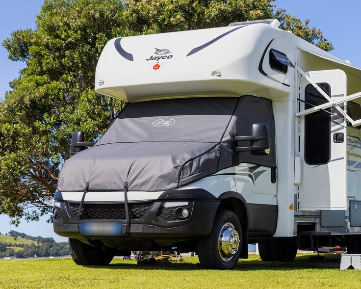 The OCD windscreen covers have been patterned for each vehicle type and are attached to the motorhome with four physical attachment points. The cover is mounted on the top corner of the driver's & passenger's doors. Customized leather surrounds fit around each of the side mirrors. A series of magnets along the back edge of the doors, under the windows and around the bottom edge of the bonnet add additional security for the cover. It is important to note, installation take just 3-4 minutes and a substantial carry bag is provided with each cover.