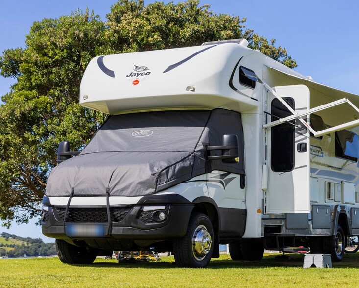 The OCD windscreen covers have been patterned for each vehicle type and are attached to the motorhome with four physical attachment points. The cover is mounted on the top corner of the driver's & passenger's doors. Customized leather surrounds fit around each of the side mirrors. A series of magnets along the back edge of the doors, under the windows and around the bottom edge of the bonnet add additional security for the cover. It is important to note, installation take just 3-4 minutes and a substantial carry bag is provided with each cover.